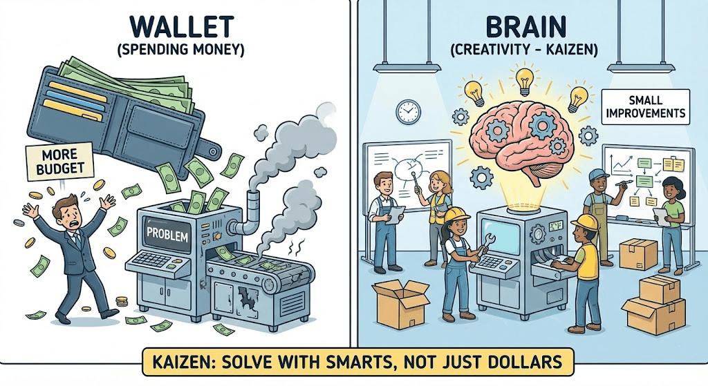 Some companies think the answer to every problem is “hire more people” or “buy more expensive software.” Kaizen says: Wait! Before you spend a dime, use your creativity. Can we move the furniture? Can we change the schedule? Can we simplify the paperwork? The best Kaizen teams solve problems with smart thinking and experiments before they ever reach for a checkbook.